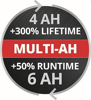 - Technologie MULTI-Ah : batterie 6Ah pour une capacité maximale ou batterie 4Ah